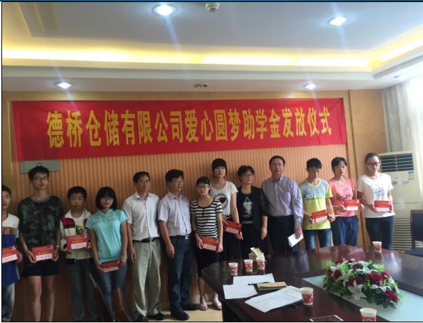 8月21日上午,江苏德桥2015年爱心圆梦助学金发放仪式在靖江市新港城幼儿园举行,江苏德桥董事长顾文龙先生、靖江市慈善总会毛科长、新港城慈善分会张科长、新港城政府领导等参加了仪式,为贫困学子发放爱心圆梦助学金。